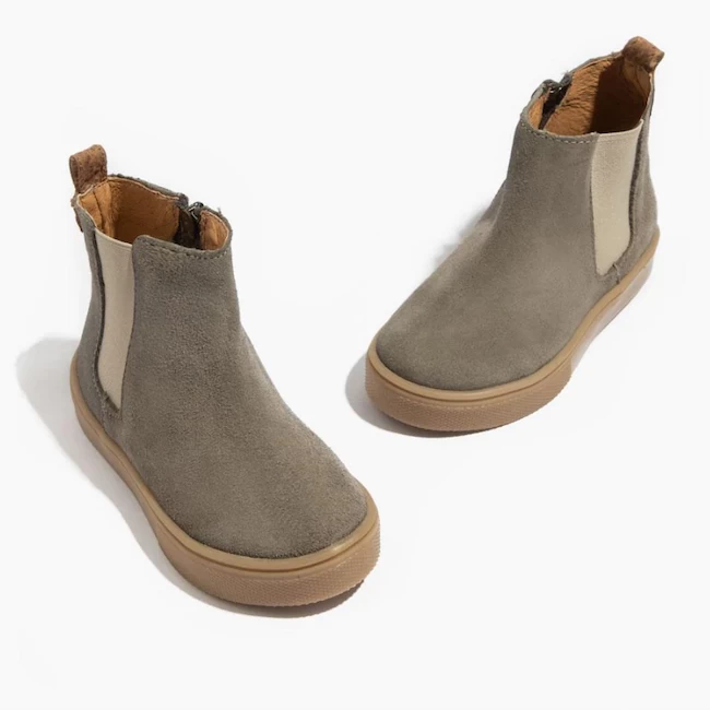 For the NEXT step in your kid’s life, slip into our brand-new Chelsea Boots! You asked for more chelsea boots and we listened! Introducing the Grey Chelsea Boots made of our genuine suede leather and textured rubber soles. The boots include an elastic outer side and zippered inner for easy/off access that will stay on your babes foot. These are absolute must haves this fall!